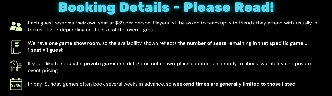 We have one game show room, so the availability shown reflects the number of seats remaining in that specific game, not the number of games left to book